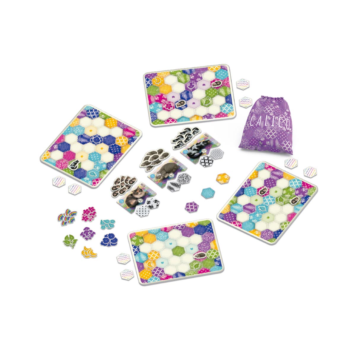 En Calico, los jugadores compiten para tejer la colcha mas cómoda cogiendo y colocando parches de diferentes colores y estampados en su tablero de colcha. Cada tablero tendrá 3 objetivos de diseño que otorgarán puntos si se cumplen sus requisitos. Los jugadores intentarán además crear grupos de estampados para atraer a los gatos más adorables y grupos de colores en los que coser botones. ¡El jugador que obtenga más puntos por sus diseños, gatos y botones, gana la partida.