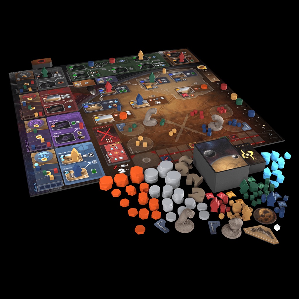 Tablero de juego de doble cara, 12 agentes de madera, 95+ piezas de madera para jugadores, 75+ fichas de madera para recursos, 4 miniaturas de gusano de arena, 250+ cartas, 9 líderes, 60+ fichas de cartón, dos tableros personales para partidas a seis jugadores.