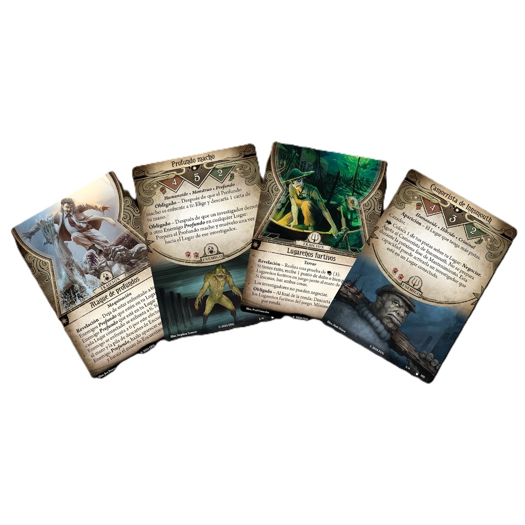 Esta expansión incluye todo el contenido de los escenarios que se incluyeron originalmente en el ciclo La conspiración de Innsmouth, ahora reunido en una sola caja.