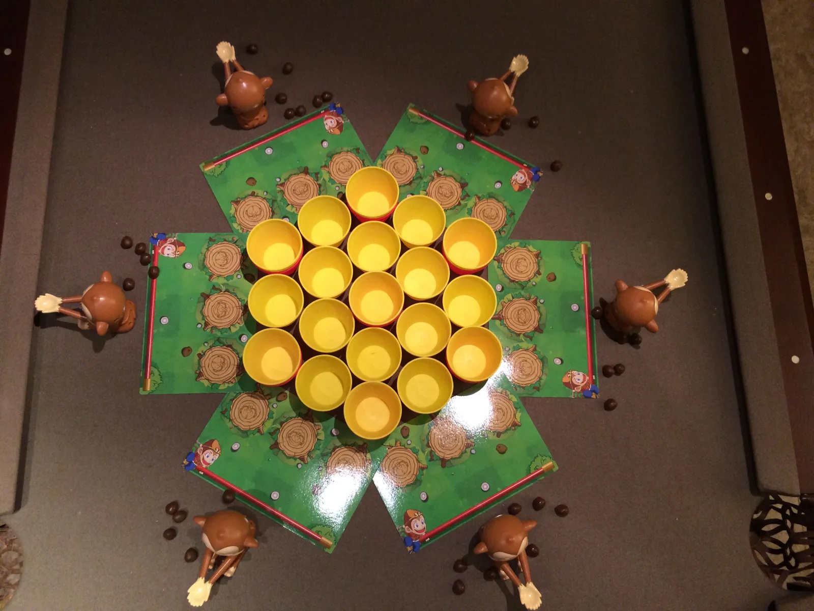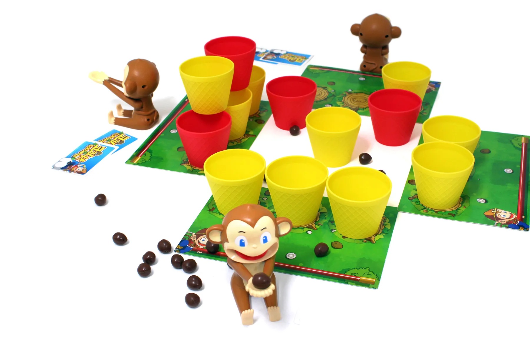 Jugando las cartas especiales de magia, obligarás a tus oponentes a disparar con los ojos cerrados, desde lejos, o de cualquier forma que dificulte sus lanzamientos. Quien primero complete una pirámide de seis cestas en su tablero ¡será coronado Rey Mono! Cuando todos los cocos estén dentro de las cestas, el jugador con más cocos en las cestas de su tablero será el ganador.