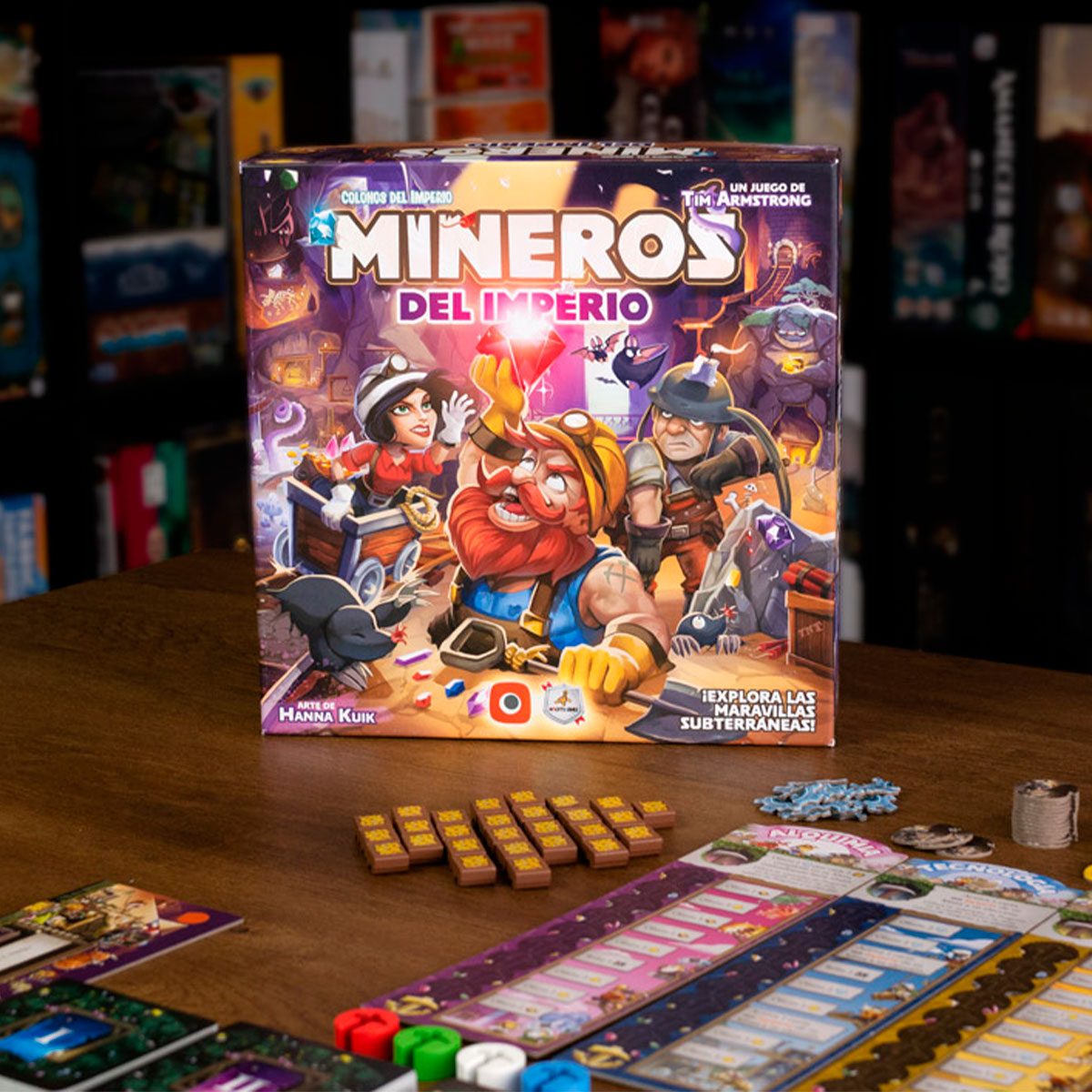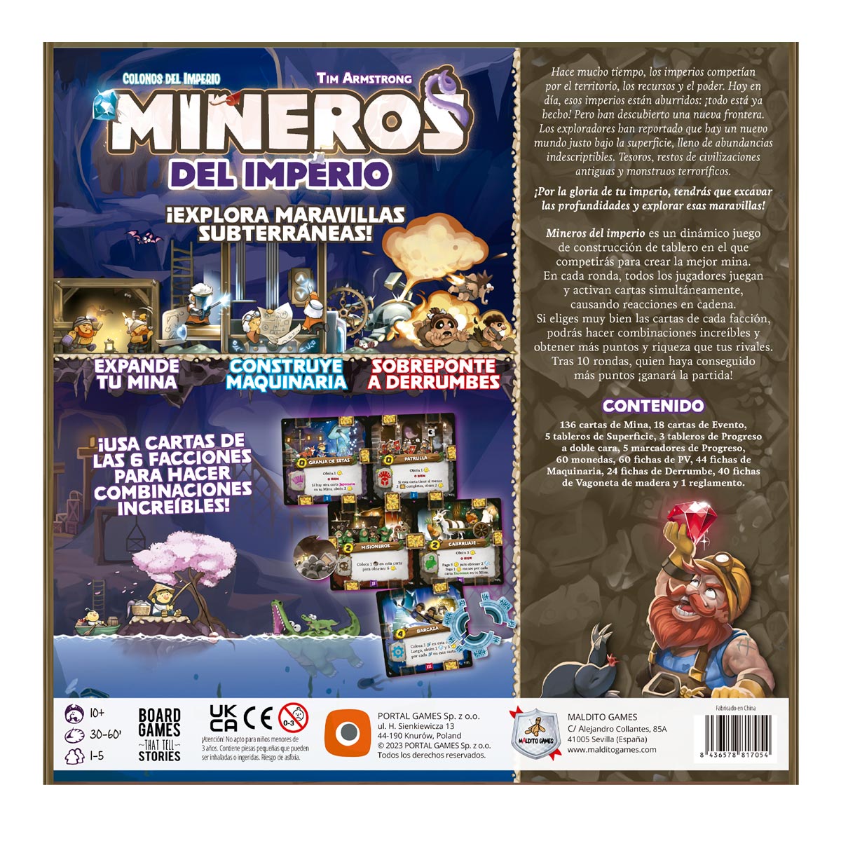 Mineros del imperio es un dinámico juego de construcción de tablero en el que competirás para crear la mejor mina. En cada ronda, todos los jugadores juegan y activan cartas simultáneamente, causando reacciones en cadena. Si eliges muy bien las cartas de cada facción, podrás hacer combinaciones increíbles y obtener más puntos y riqueza que tus rivales. Tras 10 rondas, quien haya conseguido más puntos ¡ganará la partida!