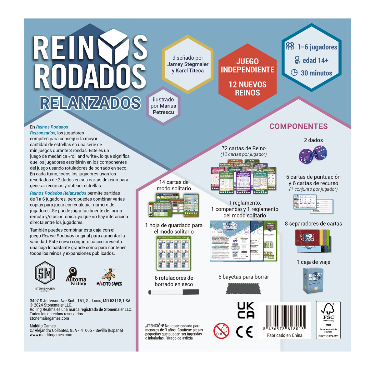 Reinos rodados relanzados permite partidas de 1 a 6 jugadores, pero puedes combinar varias copias para jugar con cualquier número de jugadores. Se puede jugar fácilmente de forma remota y/o asincrónica, ya que no hay interacción directa entre los jugadores.