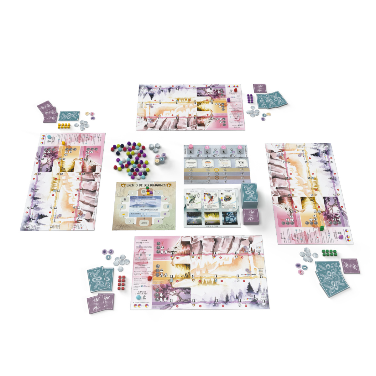 En Wyrmspan construirás un santuario para dragones. Tu santuario empieza con 3 espacios excavados a la izquierda en tu Caverna Carmesí, Gruta Gualda y Abismo Amatista. Durante la partida, excavarás más espacios en tu santuario y atraerás a dragones para que vivan en él, encadenando potentes habilidades y ganándote el favor del Gremio de los dragones.