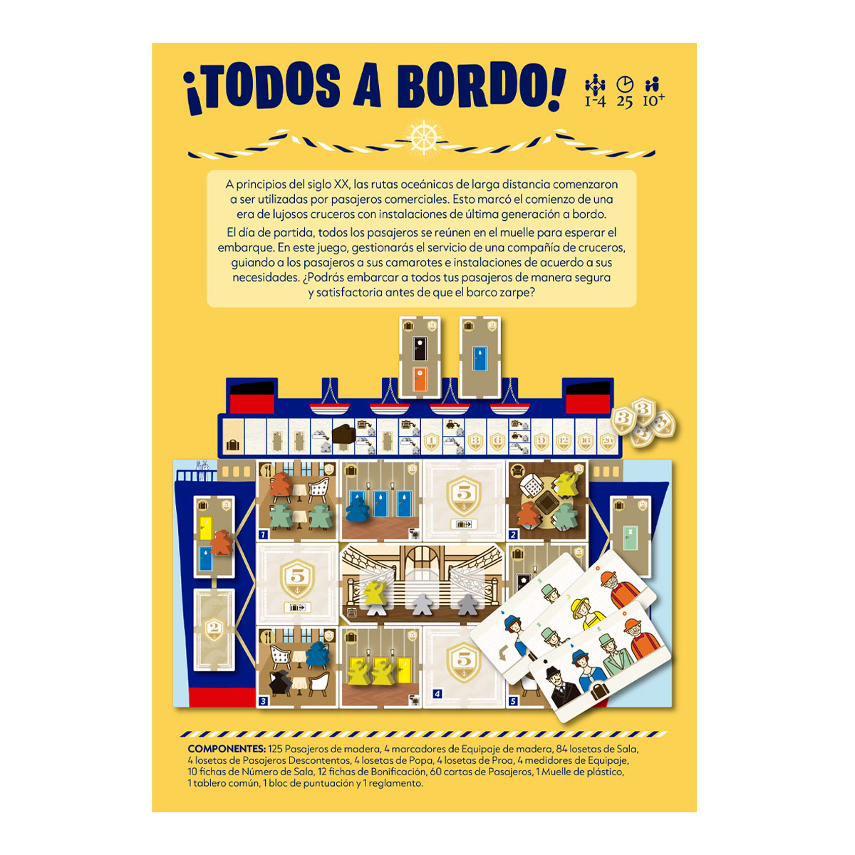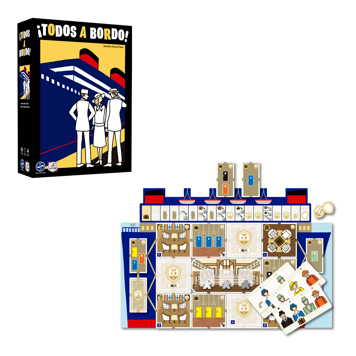 ¡Todos a bordo! es un juego de mesa para 1 a 4 jugadores en el que compites para subir pasajeros en tu crucero de lujo, llevándolos a sus camarotes y salas favoritas. Los jugadores pueden disfrutar de un juego delicioso, reflexivo, brillantemente ilustrado, de reglas sencillas, pero de desarrollo desafiante.